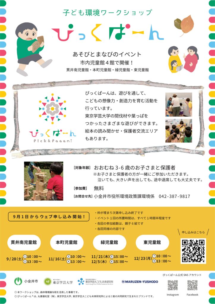 ◆令和6年度子ども環境ワークショップ「ぴっくぱーん」参加者を募集します(森林環境譲与税活用事業) 参加費:無料 東京学芸大の間伐材や葉っぱをつかった遊びのワークショップ 絵本の読み聞かせや保護者間交流など様々なエリアで遊べます。 (泣いても、大きな声を出しても、途中退席しても大丈夫です!) ぴっくぱーんは、遊びを通して、こどもの想像力・想像力を育む活動です。 >詳しくはこちら