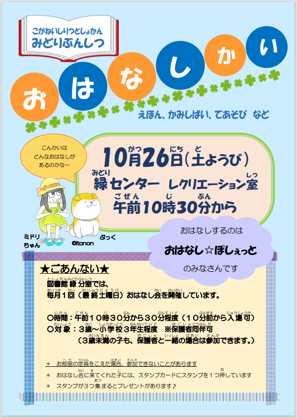 ◆2024/10/26(土) 10:30-11:00 公民館緑分館にて 主催:小金井市立図書館