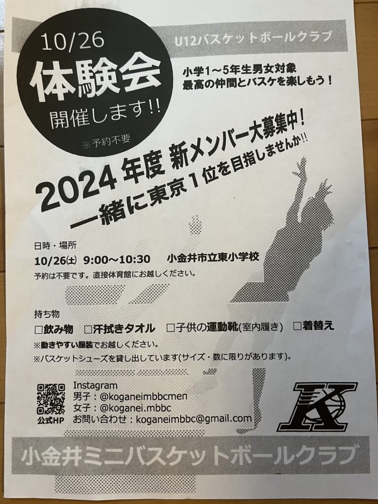 ◆2024/10/26(土)9:00-10:30 小金井市立東小にて 主催:小金井ミニバスケットボールクラブ