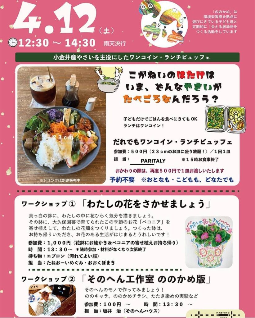 ◆2025/4/12(土)12:30-14:30 環境楽習館(貫井南朝3-2-16)にて 参加費:500円 主催:環境楽習館 【ワークショップ】「わたしの花をさかせましょう」 13:30- 参加費:1000円 【ワークショップ】「そのへん工作室 ののかめ版」 13:30- 参加費:100円- >環境楽習館