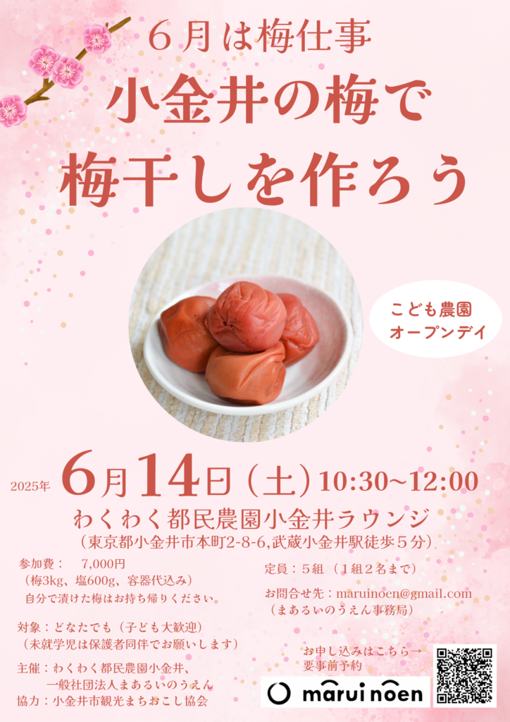 小金井市の梅で作ることができ、1組2名までOKということなので、親子や友達と一緒に参加しやすい設定です。