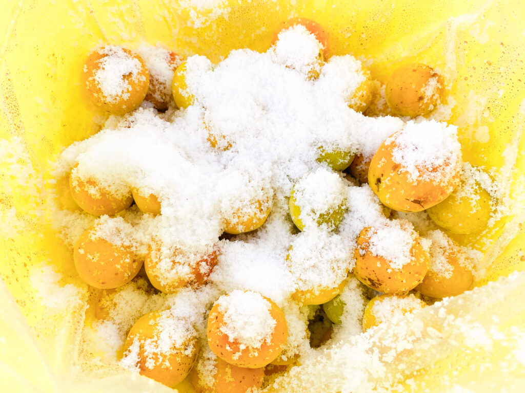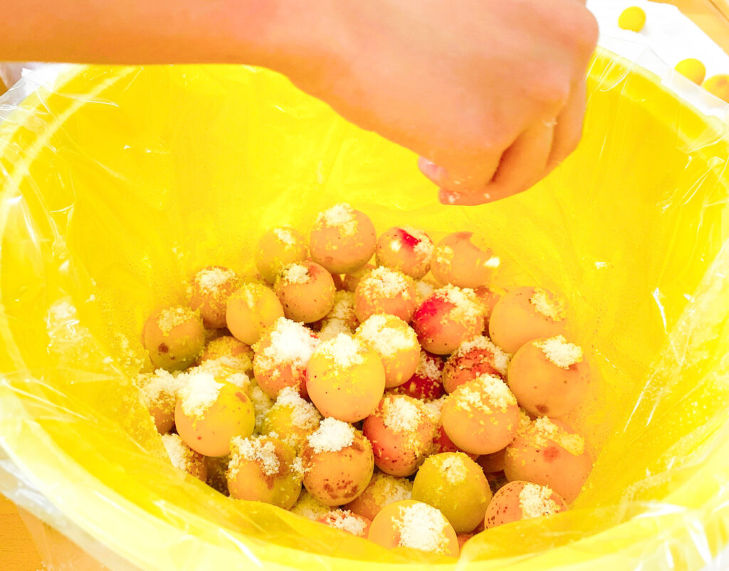 梅は洗って、ヘタを取って、塩と重ねていきます。意外と簡単です。
