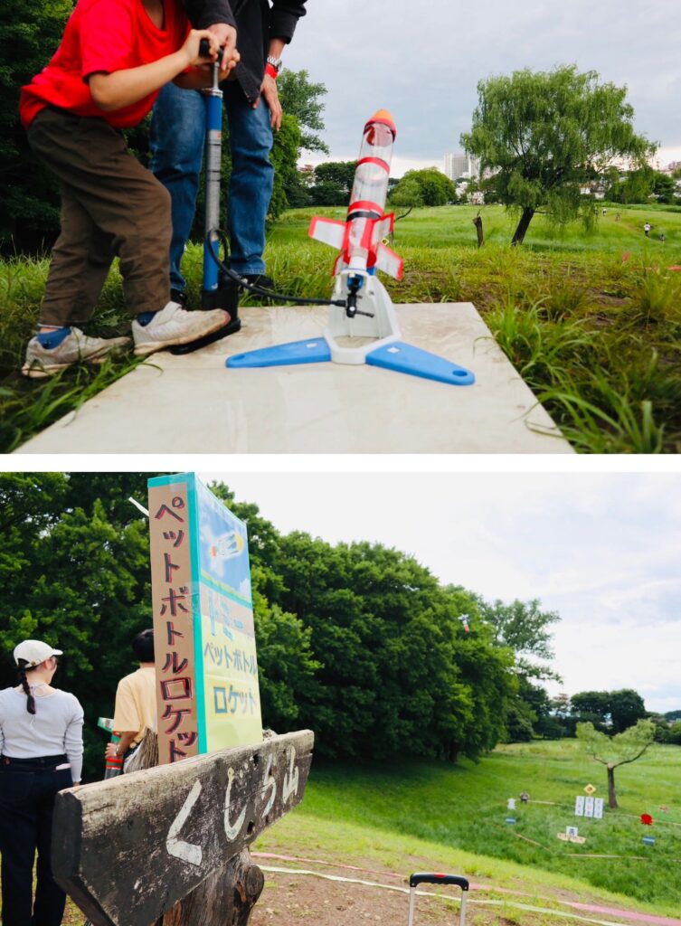 こどもたちはスタッフの方のサポートを受け、ペットボトルに空気を入れ、的を狙って発射します。勢いよく飛ぶペットボトルロケットに、こどもたちの目が輝いていました。