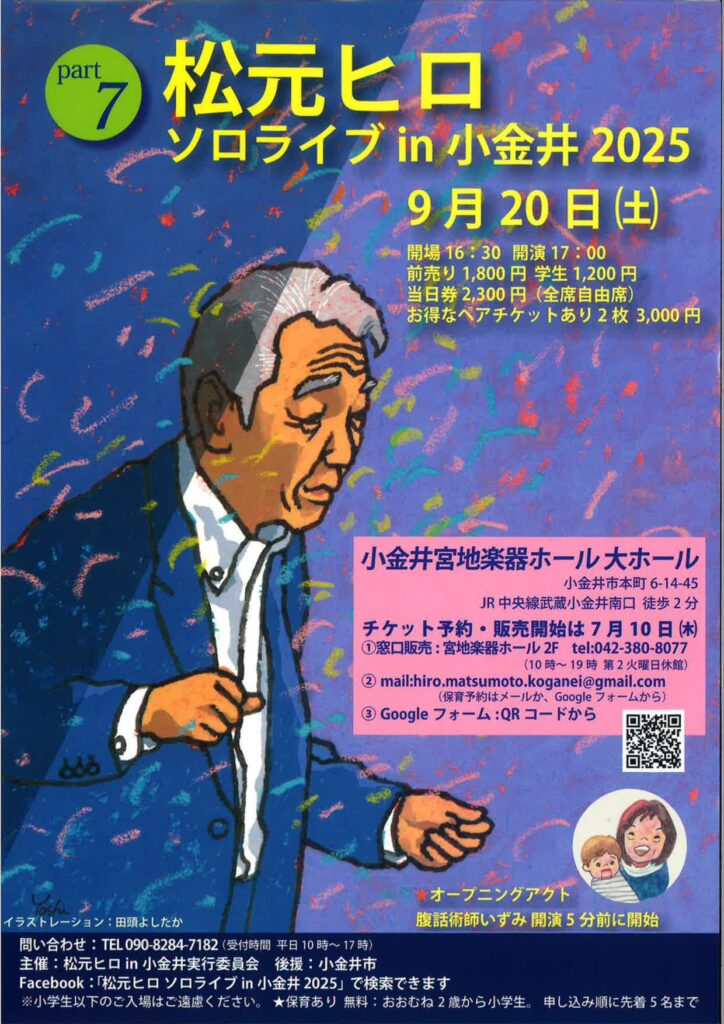 ◆2025/9/20(土)17:00- 宮地楽器ホールにて 主催:松元ヒロソロライブ㏌小金井実行委員会