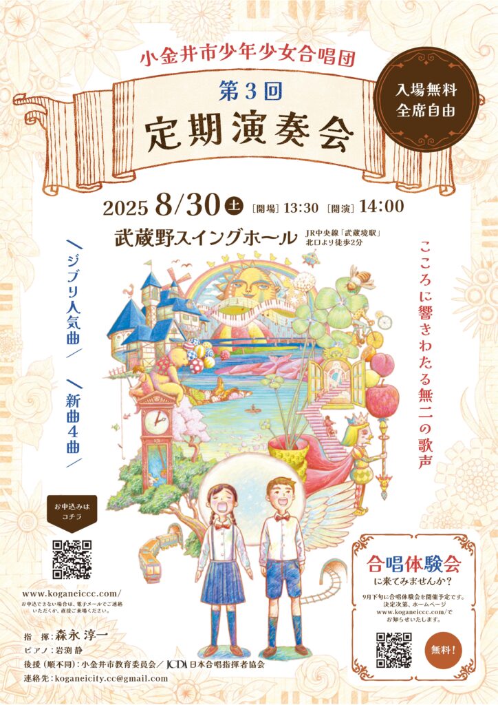 ◆2025/8/30(土)14:00- 武蔵野スイングホールにて(武蔵境) 主催:小金井市少年少女合唱団 申し込みフォーム 合唱団HP 問合せ先:koganeicity.cc@gmail.com 夏休みの最後の週末に第3回定期演奏会を開催します。 今回は、小金井地元の「ジブリ」の映画より人気の曲、 全日本児童音楽協会の作詞家・作曲家の先生方が新しく作った曲を中心に歌います。 9月下旬には体験会も予定しています。 詳細はHPでお知らせします。