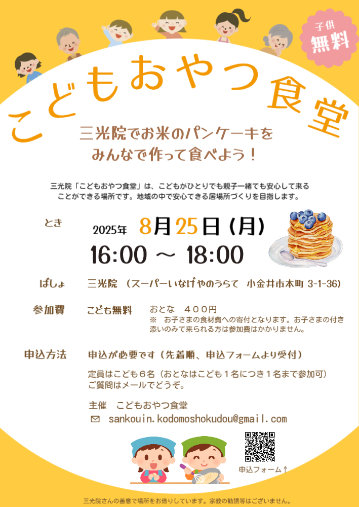 参加費:子ども無料,高校生以上400円 主催:こどもおやつ食堂