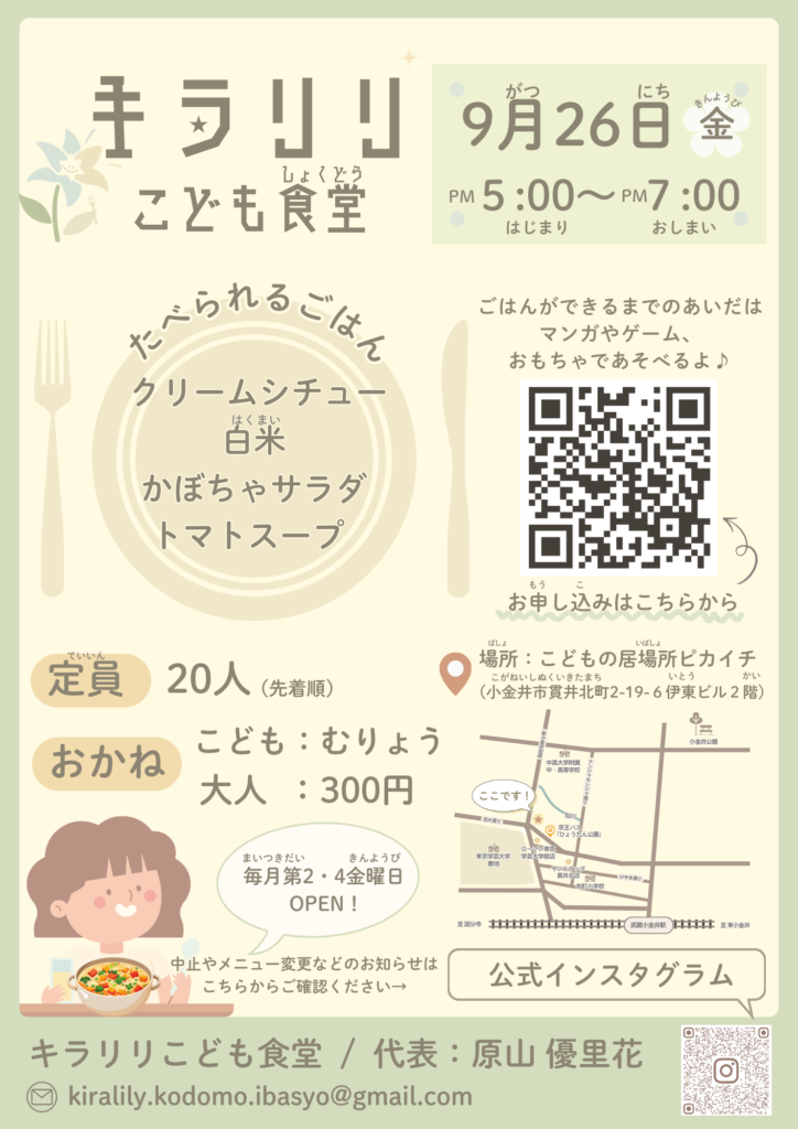 ◆2025/9/26(金)17:00-19:00 こどもの居場所ピカイチにて(貫井北町2−19-6) 参加費:高校生以下無料, 大人300円 主催:キラリリこども食堂 申し込みフォーム >Instagramはこちら