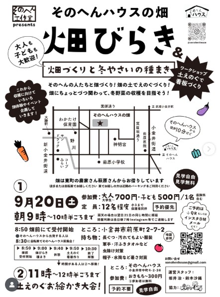 ◆2025/9/20(土)①9:00-10:30 萩原さんの畑にて(前原町2-7-2) 参加費:大人700円, こども500円 ②11:00-12:30 そのへんハウスにて(中町4-2-36) 参加費:おきもち~300円 申し込みフォーム >Instagramはこちら