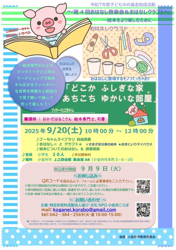 ◆2025/9/20(土)10:00-12:00 上之原会館にて 主催:遊び・文化NPO小金井こらぼ