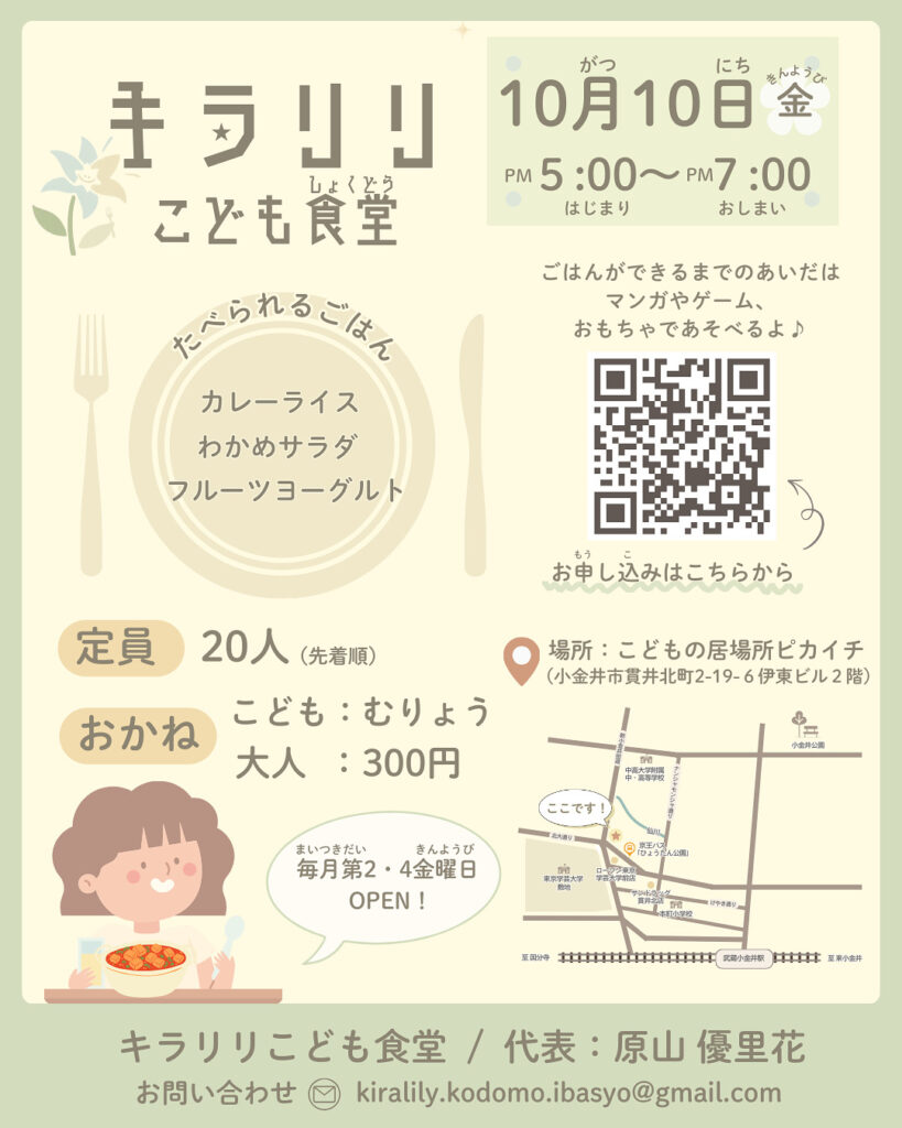 ◆2025/10/10(金)17:00-19:00 こどもの居場所ピカイチにて(貫井北町2−19-6) 参加費:高校生以下無料, 大人300円 主催:キラリリこども食堂 申し込みフォーム >Instagramはこちら