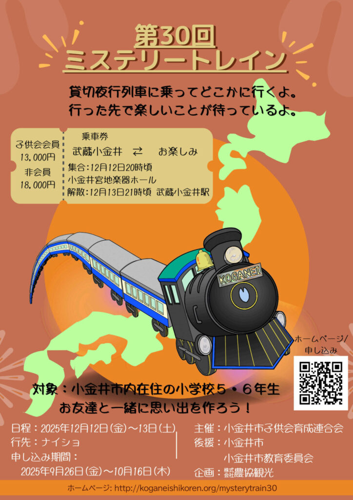 ◆2025/12/12(金)20:00-13(土)21:00 宮地楽器ホール集合 主催:小金井市子供会育成連合会 参加費:子供会会員13,000円 非会員18,000円 >詳しくはこちら 申し込みフォーム