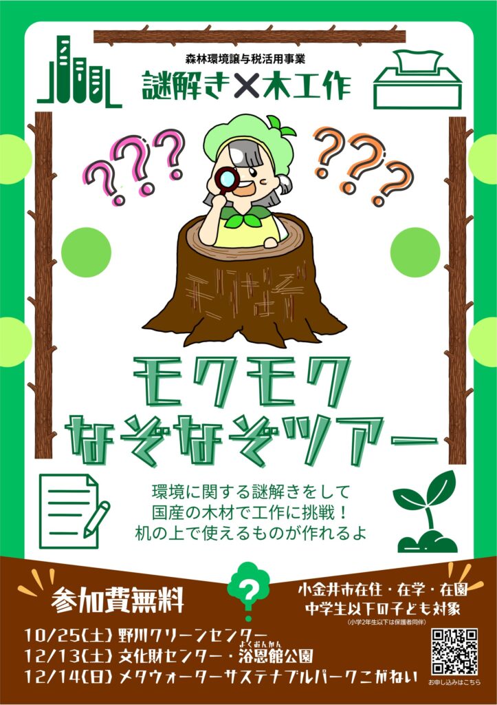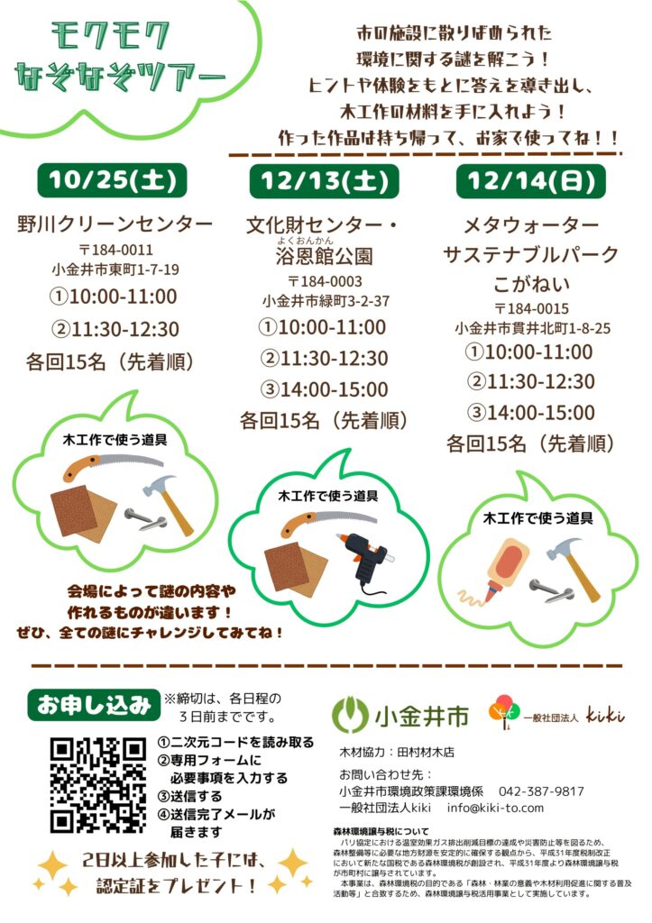 ◆2025/10/25(土)10:00-11:00, 11:30-12:30 野川クリーンセンターにて 12/13(土)10:00-11:00, 11:30-12:30, 14:00-15:00 文化財センター(浴恩館公園)にて 12/14(日)10:00-11:00, 11:30-12:30, 14:00-15:00 メタウォーターサステナブルパークこがねいにて 参加費:無料 主催:小金井市,kiki >詳しくはこちら