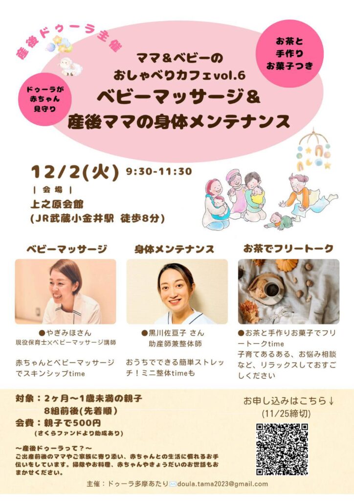 2025年12月2日(火)武蔵小金井駅前の上之原会館にて、産後ドゥーラの子育てサロン「ベビーマッサージ&産後ママの身体メンテナンス」を開催します!