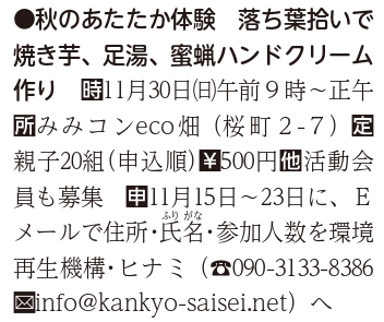 ◆2025/11/30(日)9:00-12:00 みみコンeco畑にて(桜町2-7) 参加費:500円
