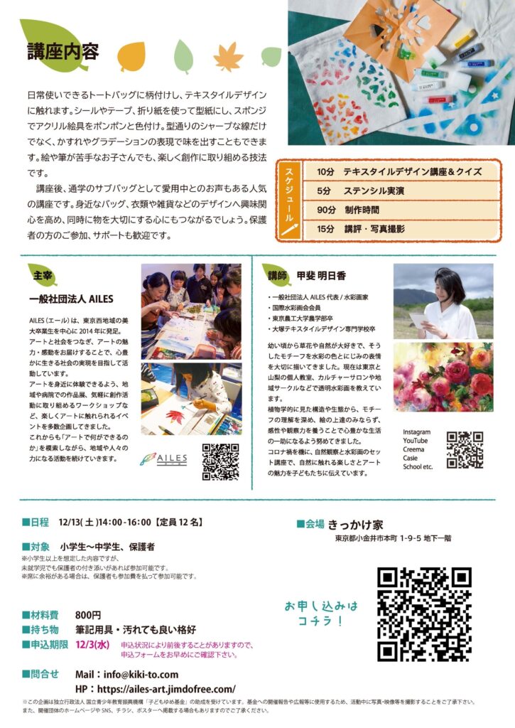 ◆2025/12/13(土)14:00-16:00 きっかけ家にて 参加費:800円 主催:一般社団法人AILES 申し込みフォーム >Instagramはこちら お問い合わせ:info@kiki-to.com ※本イベントは「子どもゆめ基金助成活動」として実施されます。
