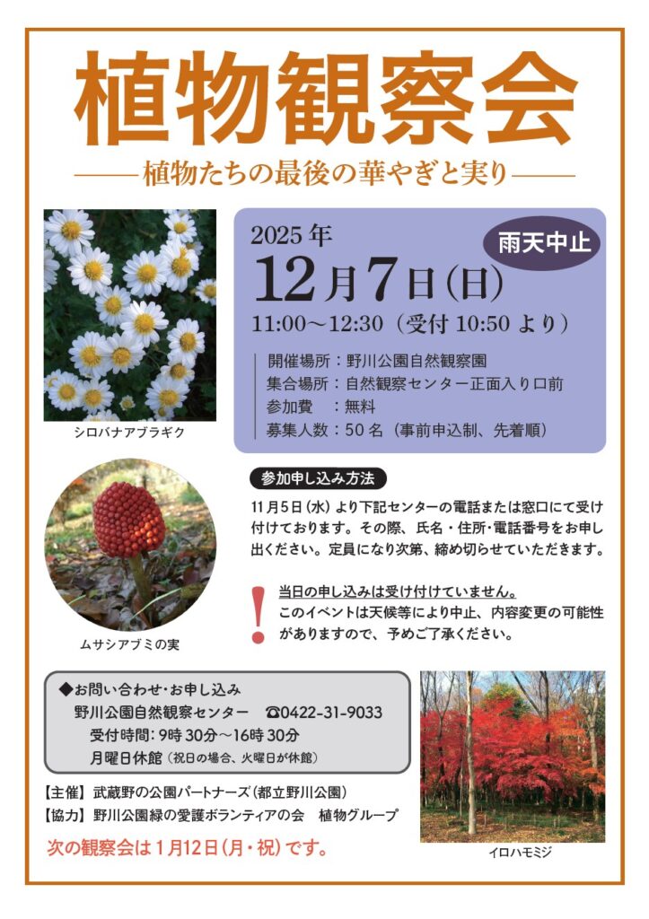 ◆2025/12/7(日) 11:00-12:30 野川公園にて 主催:武蔵野公園パートナーズ