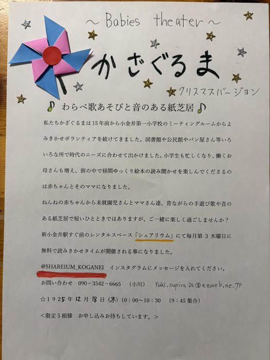 ◆2025/12/18(木)10:00-10:30 シェアリウムにて(東町4-3-11) 主催:シェアリウム