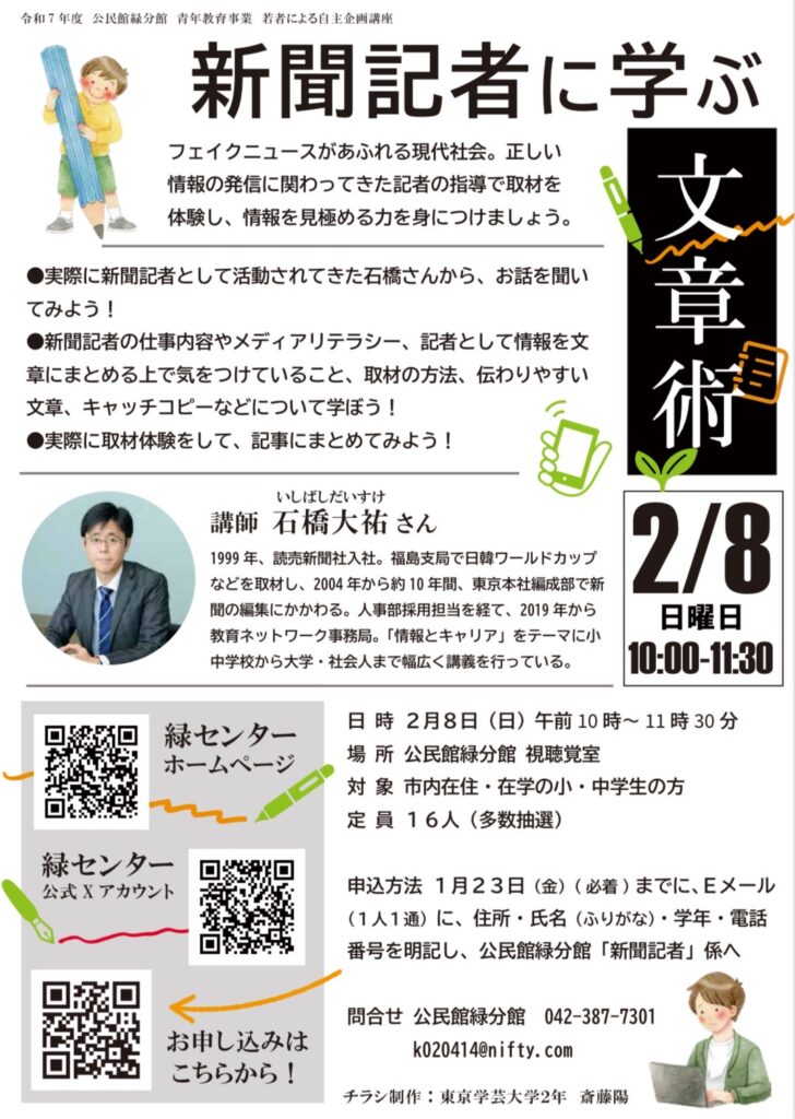 ◆2026/2/8(日)10:00-11:30 公民館緑分館にて 参加費:無料 主催:公民館緑分館