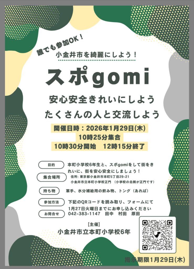 ◆2026/1/29(木)10:30-12:15 本町小集合 参加費:無料 主催:本町小6年