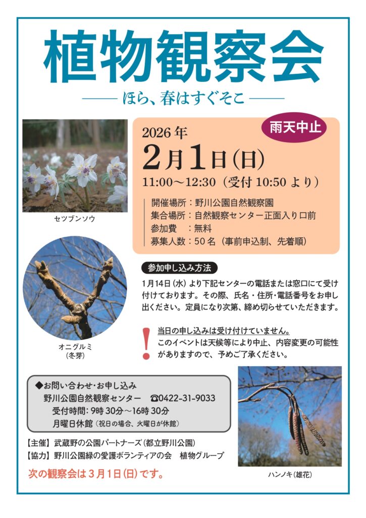 ◆2026/2/1(日)11:00-12:30 野川公園自然観察センターにて 参加費:無料