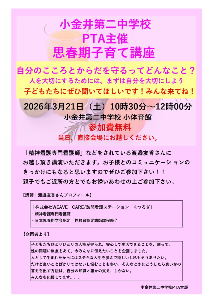◆2026/3/21(土)10:30-12:00 二中にて 参加費:無料 主催:二中PTA