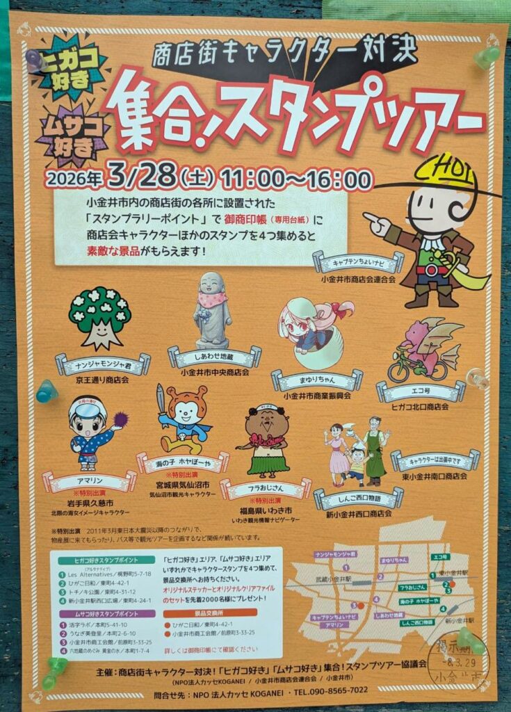 ◆2026/3/28(土)11:00-16:00 市内各商店街にて 参加費:無料 主催:「ヒガコ好き」「ムサコ好き」集合!スタンプツアー協議会・NPO法人カッセKOGANEI