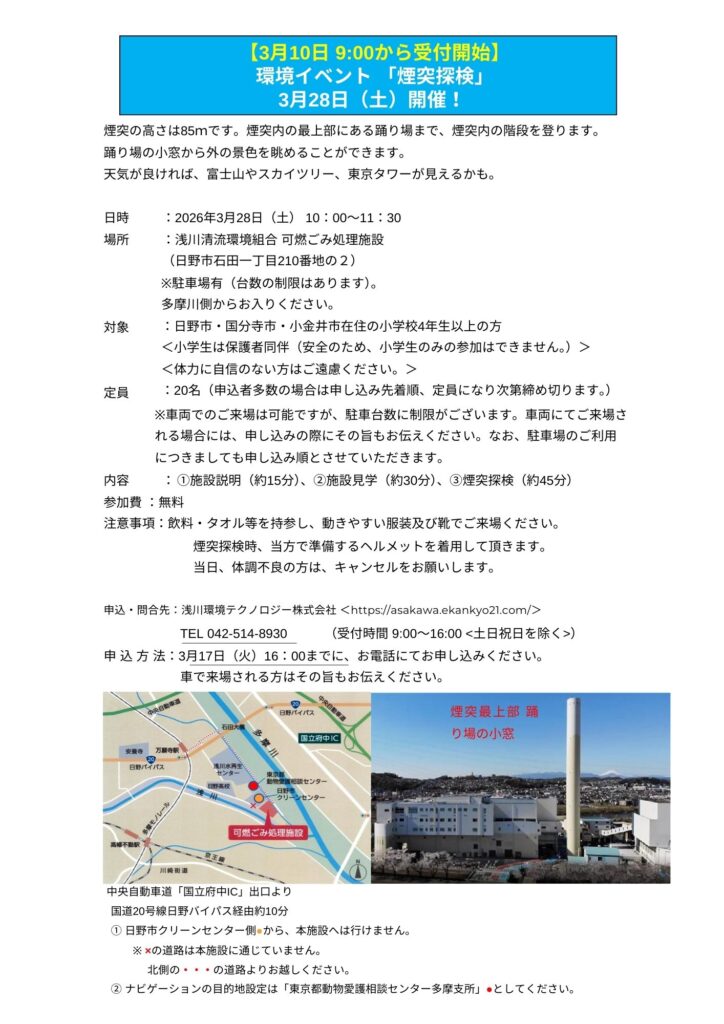 ◆2026/3/28(土)10:00-11:30 浅川清流環境組合 可燃ごみ処理施設にて 参加費:無料 主催:浅川環境テクノロジー㈱