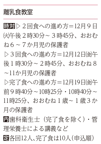 【母子保健】離乳食教室 2:30 PM – 3:45 PM2025年12月9日 ◆2回食 2025/12/9(火)14:30-15:45 3回食 2025/12/12(金)13:30-14:45 完了食 2025/12/19(金)9:40-10:25, 10:40-11:25 保健センターにて 参加費:無料 >詳しくはこちら カレンダーを表示