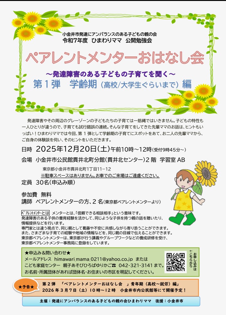 ペアレントメンターおはなし会 10:00 AM – 12:00 PM2025年12月20日 ◆2025/12/20(土)10:00-12:00 公民館貫井北分館にて 参加費:無料 主催:ひまわりママ >FBはこちら カレンダーを表示
