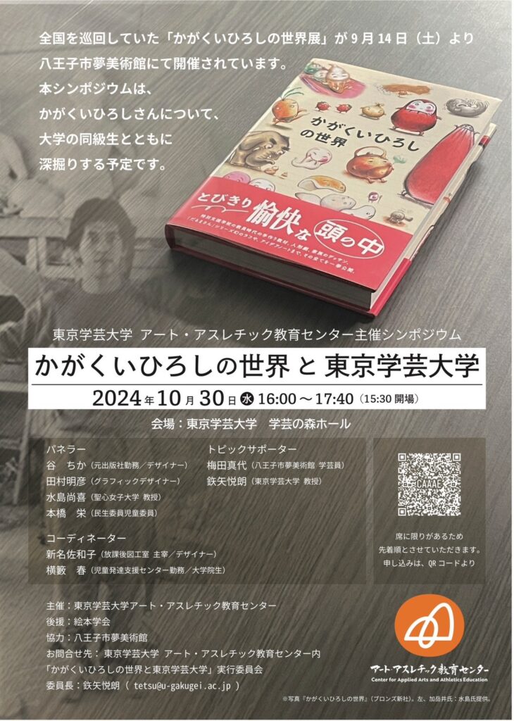 【シンポジウム】かがくいひろしの世界と東京学芸大学 4:00 PM – 5:40 PM2024年10月30日 ◆2024/10/30(水)16:00-17:40 東京学芸大学にて 主催:東京学芸大学アート・アスレチック教育センター 参加費:無料 >詳しくはこちら カレンダーを表示