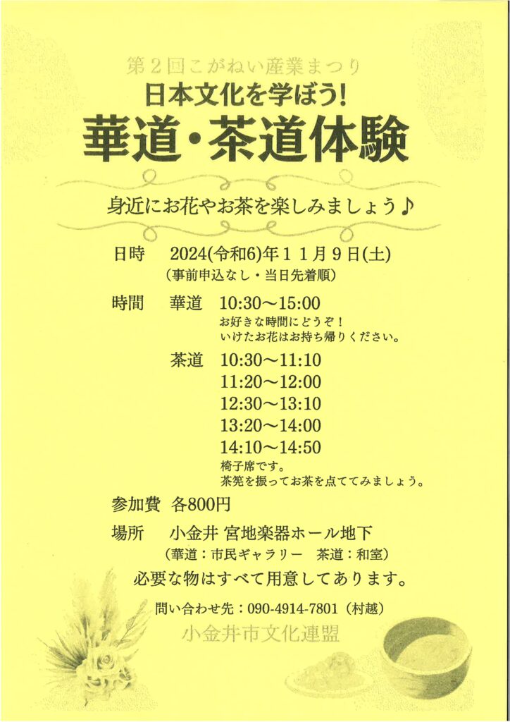 【体験】日本の文化を学ぼう!華道・茶道体験 10:30 AM – 3:00 PM2024年11月9日 ◆2024/11/9(土)10:30-15:00 宮地楽器ホールにて 主催:小金井市文化連盟 参加費:各800円 >詳しくはこちら カレンダーを表示