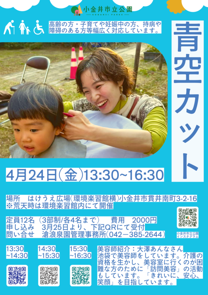 【公園で散髪】青空カット 1:30 PM – 4:30 PM2026年4月24日 ◆2025/4/24(金)13:30-16:30 はけうえ広場にて(環境楽習館) 主催:小金井市立公園 参加費:2,000円 >詳しくはこちら カレンダーを表示