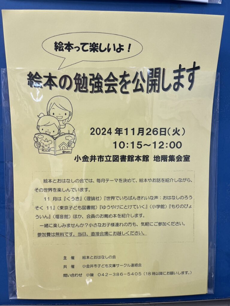 【図書館】絵本の勉強会を公開します 10:15 AM – 12:00 PM2024年11月26日 ◆2024/11/26(火)10:15-12:00 小金井市立図書館本館にて 主催:絵本とおはなしの会 参加費:無料 カレンダーを表示