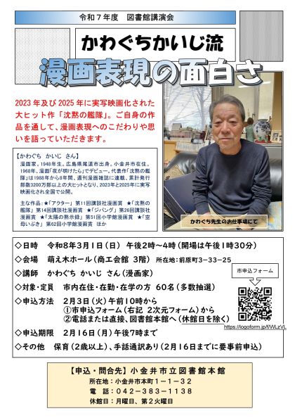 【図書館講演会】かわぐちかいじ流 漫画表現の面白さ 2:00 PM – 4:00 PM2026年3月1日 ◆2026/3/1(日)14:00-16:00 萌え木ホールにて 参加費:無料 主催:図書館本館 >詳しくはこちら 申し込みフォーム カレンダーを表示