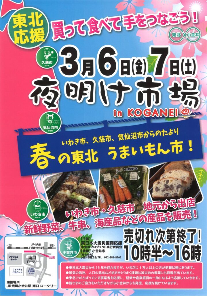 【夜明け市場】春の東北 うまいもん市! 10:30 AM – 4:00 PM2026年3月7日 ◆2026/3/6(金), 7(土) 10:30-16:00 武蔵小金井駅南口にて 主催:東日本大震災復興応援 小金井プロジェクト実行委員会 参加費:無料 >詳しくはこちら カレンダーを表示