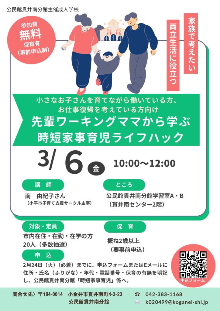 【講座】先輩ワーキングママから学ぶ 時短家事育児ライフハック 10:00 AM – 12:00 PM2026年3月6日 ◆2026/3/6(金)10:00-12:00 公民館貫井南分館にて 参加費:無料 主催:公民館貫井南分館 >詳しくはこちら 申し込みフォーム カレンダーを表示