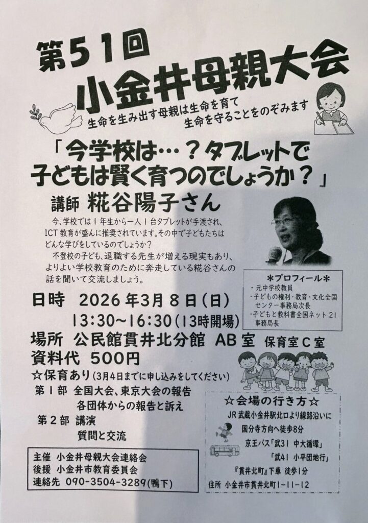【講演会】小金井母親大会 1:30 PM – 4:30 PM2026年3月8日 ◆2026/3/8(日)13:30-16:30 公民館貫井北分館にて 参加費:500円 主催:小金井母親大会連絡会 カレンダーを表示