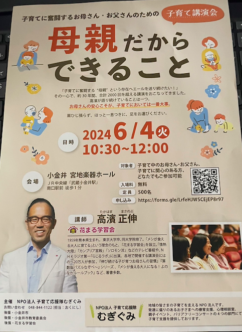 【講演会】母親だからできること 10:30 AM – 12:00 PM2024年6月4日 ◆2024/6/4(火)10:30-12:00 小金井宮地楽器ホールにて 入場料:無料 申込フォーム カレンダーを表示