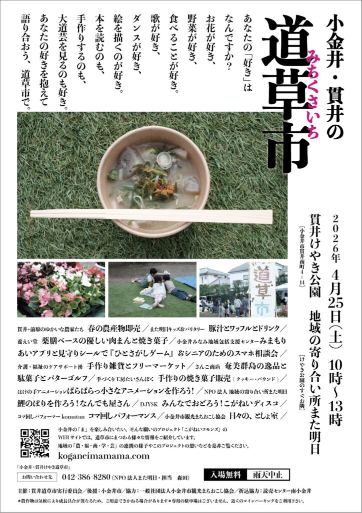 【道草市】小金井・貫井の道草市 10:00 AM – 1:00 PM2026年4月25日 ◆2026/4/25(土)10:00-13:00 貫井けやき公園にて 参加費:無料 主催:貫井道草市実行委員会 >詳しくはこちら カレンダーを表示