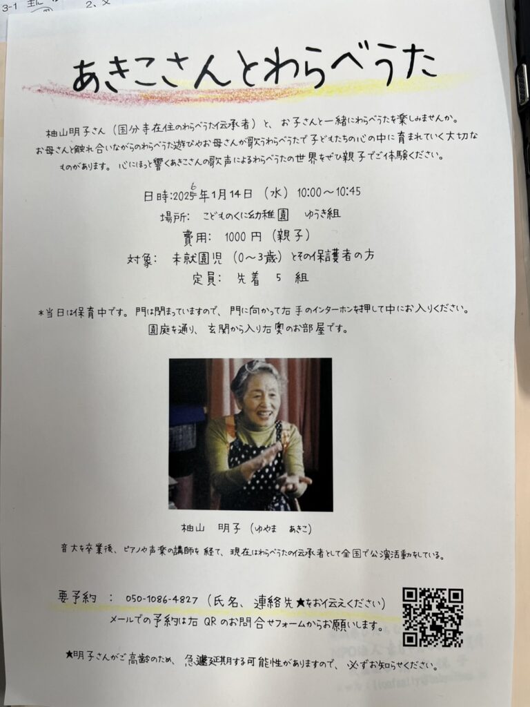 あきこさんとわらべうた 10:00 AM – 10:45 AM2026年1月14日 ◆2026/1/14(水)10:00-10:45 こどものくに幼稚園にて 主催:こどものくに幼稚園 参加費:1,000円(親子) >こどものくに幼稚園のHPはこちら カレンダーを表示