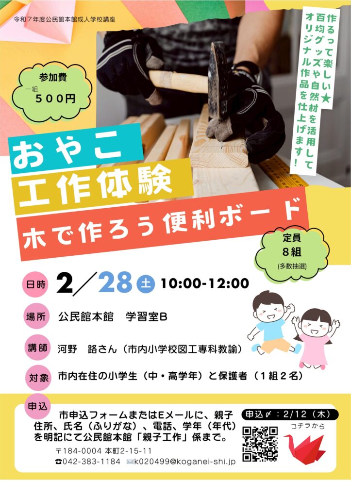 おやこで工作体験 木で作ろう便利ボード 10:00 AM – 12:00 PM2026年2月28日 ◆2026/2/28(土)10:00-12:00 公民館本館にて 参加費:500円 主催:公民館本館 >詳しくはこちら 申し込みフォーム カレンダーを表示
