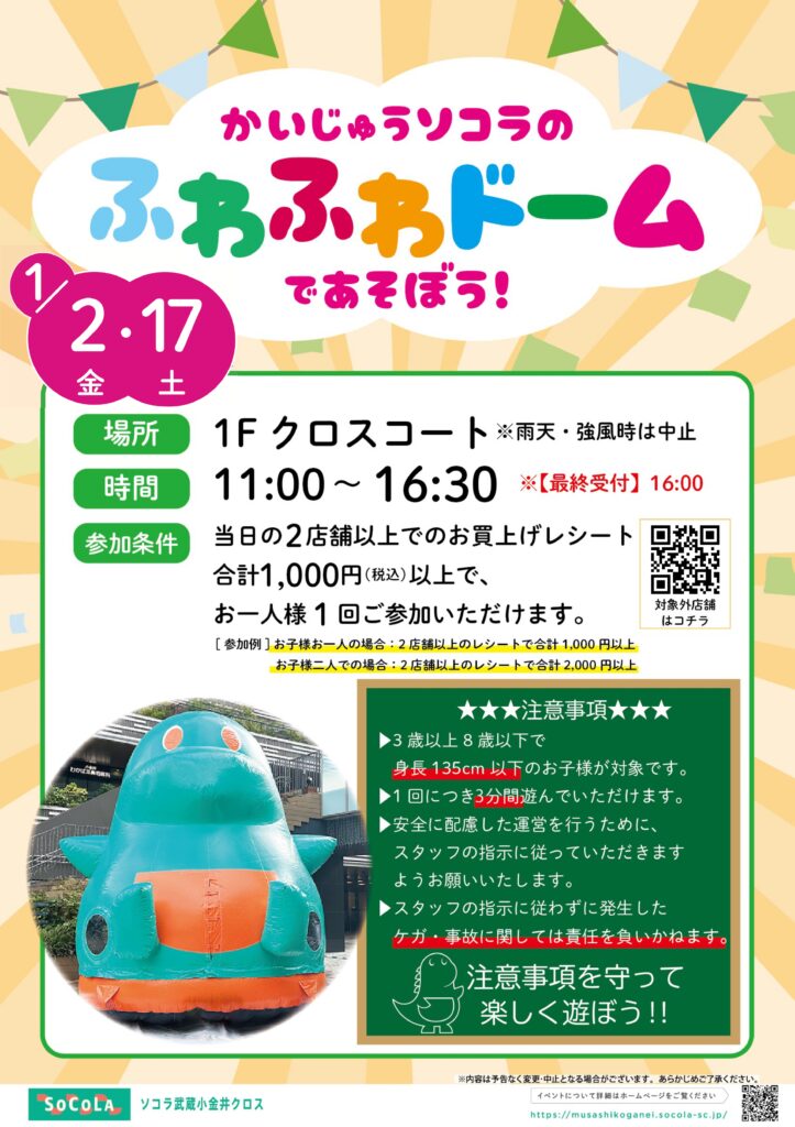 かいじゅうソコラのふわふわドームであそぼう! 11:00 AM – 4:30 PM2026年1月17日 ◆2026/1/17(土)11:00〜16:30 SOCOLAにて 主催:SOCOLA 参加費:1000円以上のレシート >詳しくはこちら カレンダーを表示