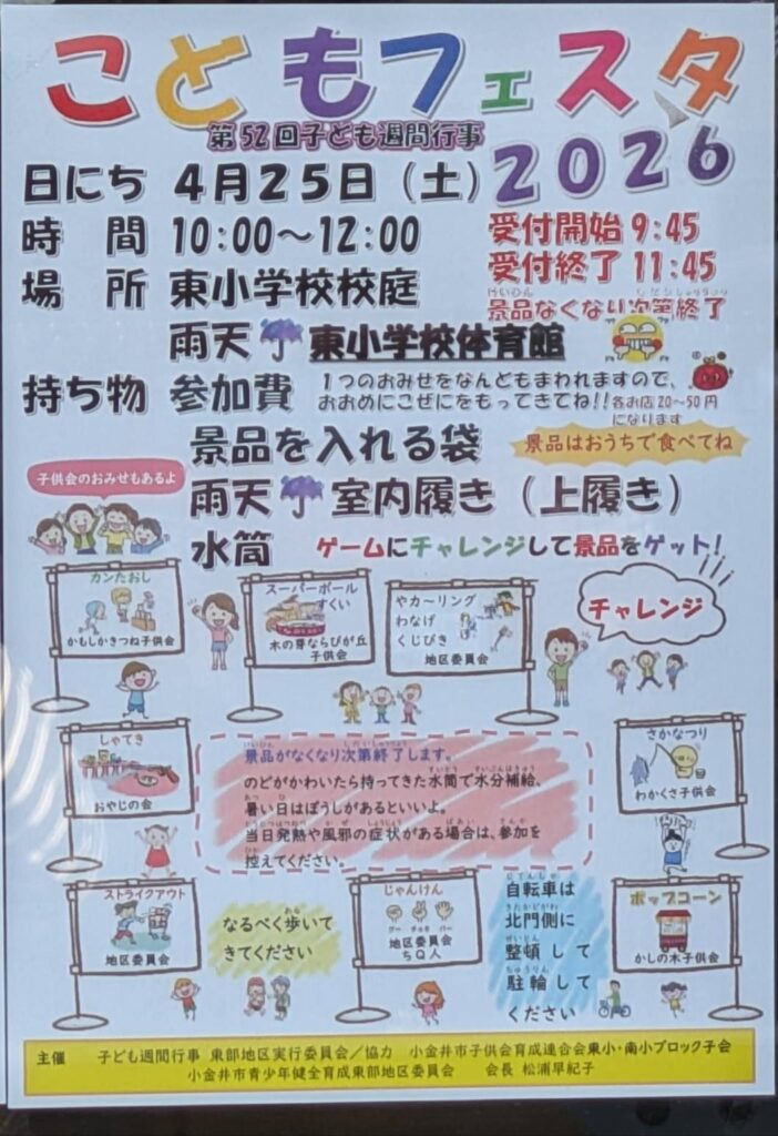 こどもフェスタ2026 10:00 AM – 12:00 PM2026年4月25日 ◆2026/4/25(土)10:00-12:00 東小学校校庭にて 主催:子ども週間行事 東部地区実行委員会 カレンダーを表示