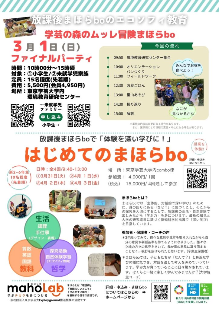 はじめてのまほらbo 9:40 AM – 1:00 PM2026年3月31日 ◆2026/3/31(火), 4/1(水), 4/2(木), 4/3(金)9:40-13:00 東京学芸大にて 参加費:4,000円/1回 15,000円/4回通し一括 実習費:1,000円/各 >詳しくはこちら カレンダーを表示