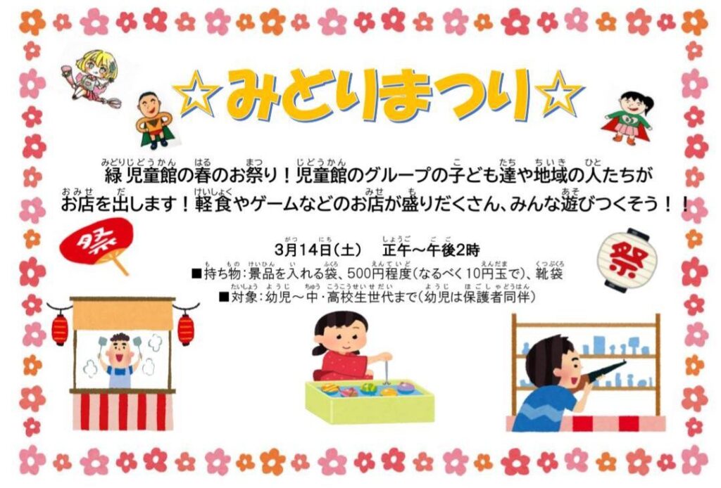 ◆2026/3/14(土)12:00-14:00 緑児童館にて 参加費:無料 主催:緑児童館