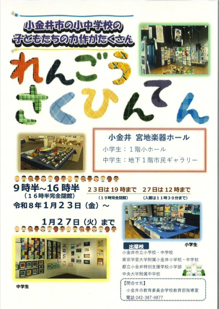 れんごうさくひんてん 9:30 AM – 4:30 PM2026年1月23日 – 2026年1月27日 ◆2026/1/23(金)-27(火)9:30-16:30(23日は19時まで、27日は12時まで) 宮地楽器ホールにて 参加費:無料 主催:小金井市教育委員会 >詳しくはこちら カレンダーを表示