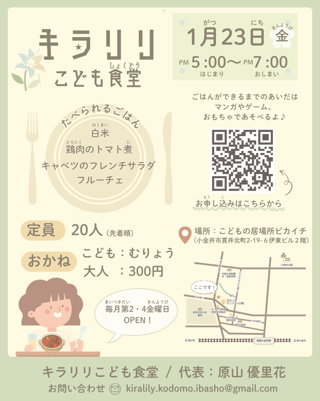 参加費:高校生以下無料, 大人300円 主催:キラリリこども食堂