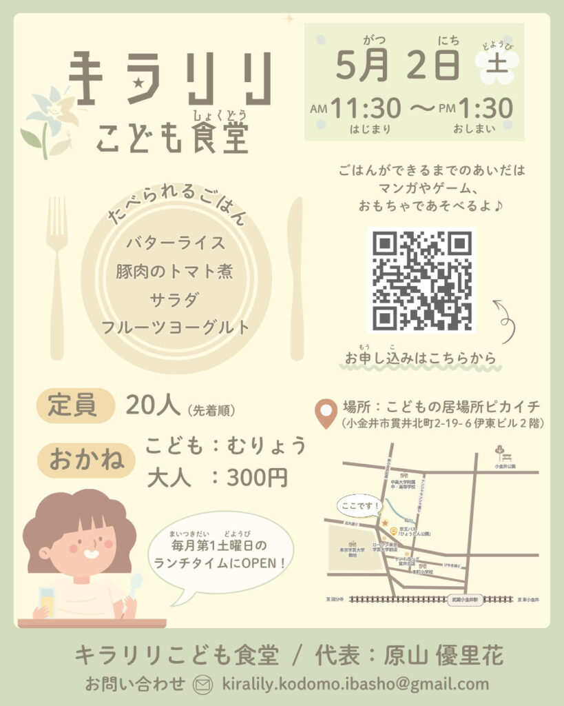参加費:こども無料, 大人300円 主催:キラリリこども食堂