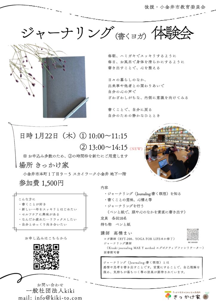 ジャーナリング(書くヨガ)体験会 1:00 PM – 2:15 PM2026年1月22日 ◆2026/1/22(木)10:00-11:15, 13:00-14:15 きっかけ家にて 参加費:1500円 主催:kiki 申し込みフォーム カレンダーを表示