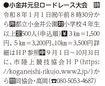 小金井元旦ロードレース大会 8:30 AM – 9:30 AM2026年1月1日 ◆2026/1/1(祝)8:30- 小金井公園にて 参加費:3km1500円 主催:公益財団法人 小金井市体育協会, 小金井市陸上競技協会 >詳しくはこちら カレンダーを表示